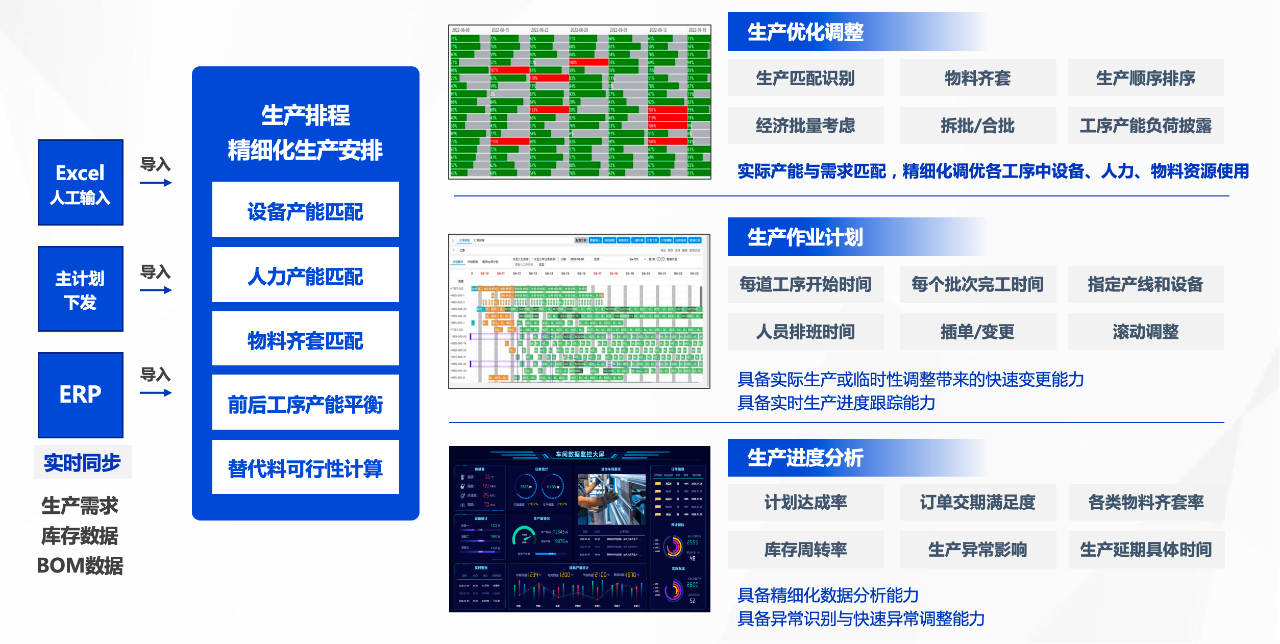 排产软件是专为优化制造业生产计划而设计的软件工具。以算法为核心,集成智能决策支持功能,能够对制造企业的生产任务、资源配置等进行合理安排。通过对订单需求、物料供应、设备状况、人力配置等多方面因素的综合考量,排产软件助力企业实现生产的有效与顺畅。其目标在于解决传统生产计划中资源分配不均、订单响应慢、数据更新滞后等问题,使生产过程更加科学、精准,让企业能在激烈的市场竞争中,凭借有效的产能与优质的交付脱颖而出。