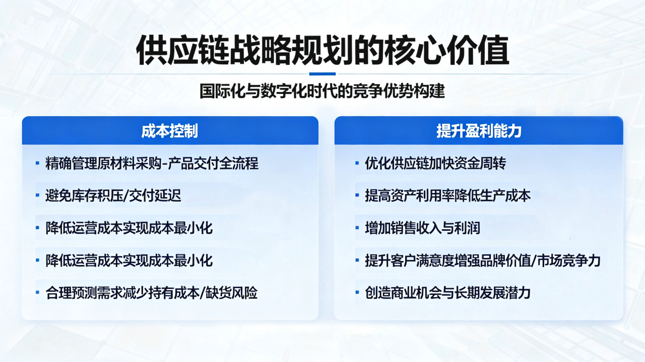 在提升盈利能力方面,优化供应链能加快资金周转,提高资产利用率,使企业以更低的成本生产出更多符合市场需求的产品,从而增加销售收入和利润。而且,良好的供应链战略规划还能提升客户满意度,增强企业的品牌价值和市场竞争力,为企业带来更多的商业机会和长期发展潜力。