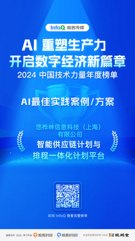 近日,由 InfoQ 发起的2024中国技术力量年度榜单评选活动落下帷幕,并揭晓了最终结果,悠桦林凭借百余家行业头部企业的实践经验,以及创新性、实践效果、技术与资源投入性、行业价值等多维度的优异表现,入选InfoQ 2024年度“2024AI最佳实践案例”。
