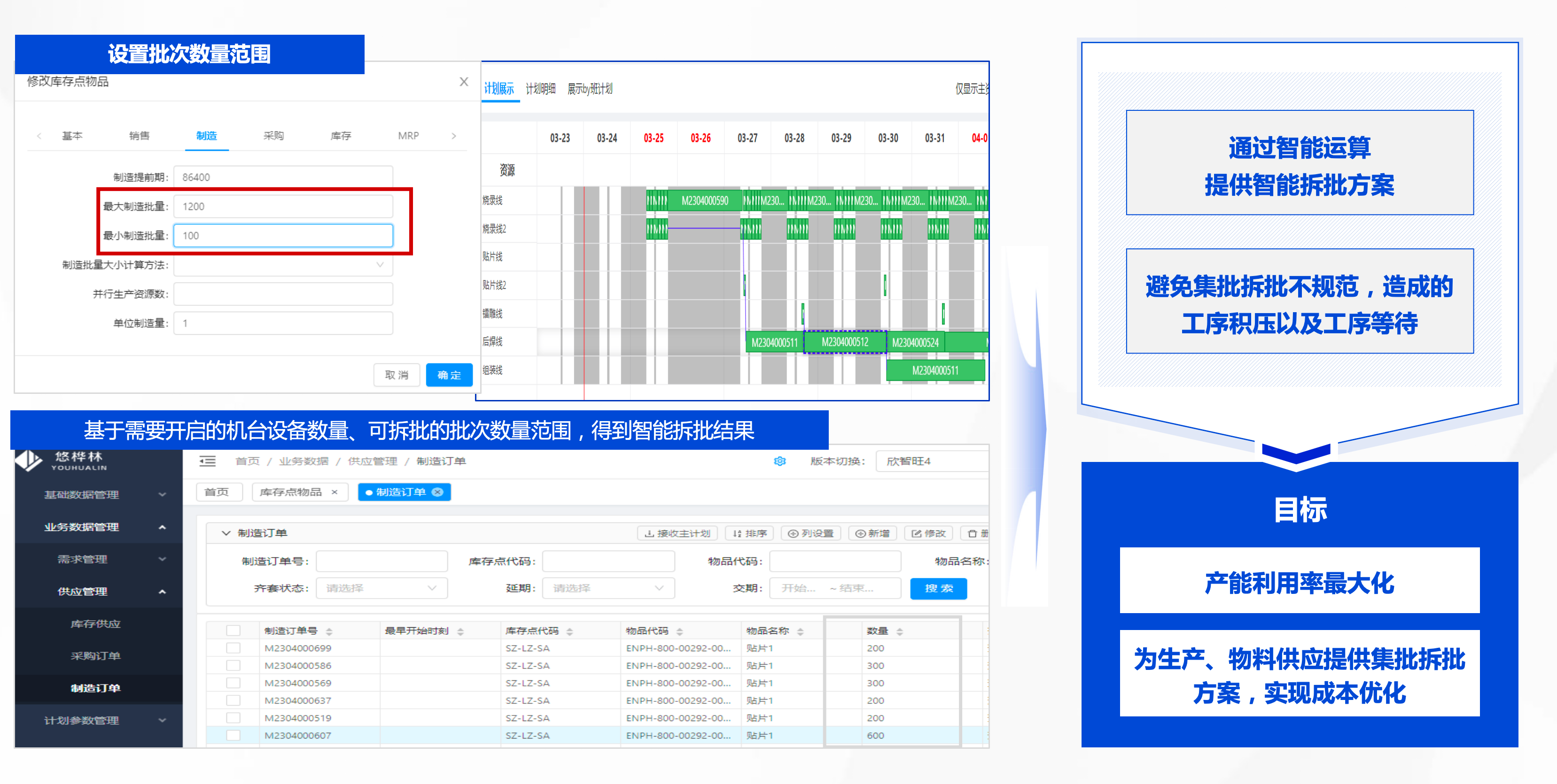 悠桦林APS排程系统功能卓越。它运用“运筹学+机器学习”进行大数据分析,能全面考虑物料、人、设备等多重限制条件,排程精确到时分秒以及各工序和机台,输出细致的生产订单执行计划,并实时跟踪计划执行情况,提前预警潜在问题。系统可跨越整个企业供应网络,综合多种业务目标和约束条件,为企业打造优化的生产、库存、采购及调拨计划,实现需求满足最大化,成本和资源损耗最小化。从库存精益、人员精益、减少换型到产能均衡等方面助力企业降低成本,在柔性排产、多目标优化、有限产能和物料约束等方面提升生产效率。