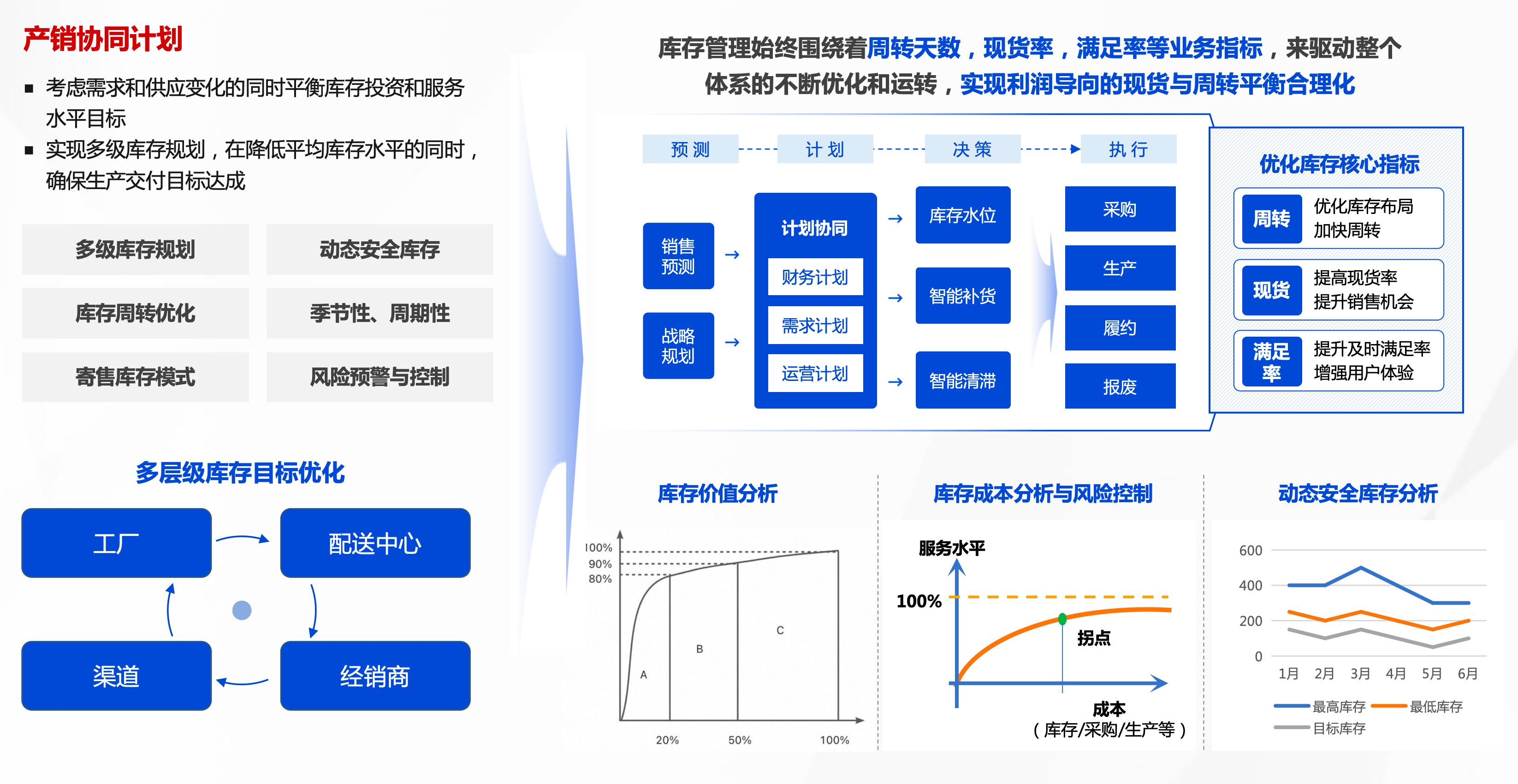 库存计划在供应链计划管理中起着平衡供需、降低成本的关键作用。其优化策略丰富多样,定量控制法通过设定库存警戒线,当库存低于该线时自动触发订购,保持库存稳定;定期控制法则按固定周期检查库存并补充,适用于需求较为稳定的产品;ABC分类法将库存物资按价值分为A、B、C三类,对不同类别物资实施不同管理策略。