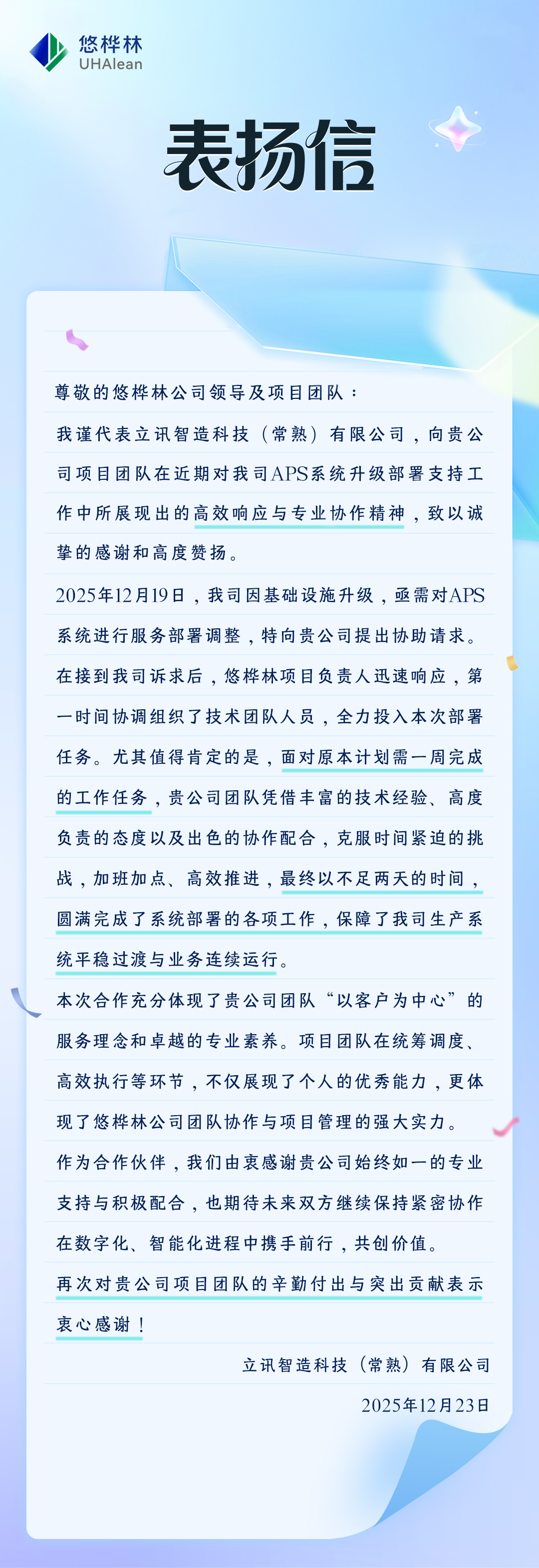 近日,悠桦林收到来自立讯智造科技(常熟)有限公司的表扬信。信中,客户对我司在APS系统升级部署过程中的高效响应、专业协作与责任担当给予了高度肯定。